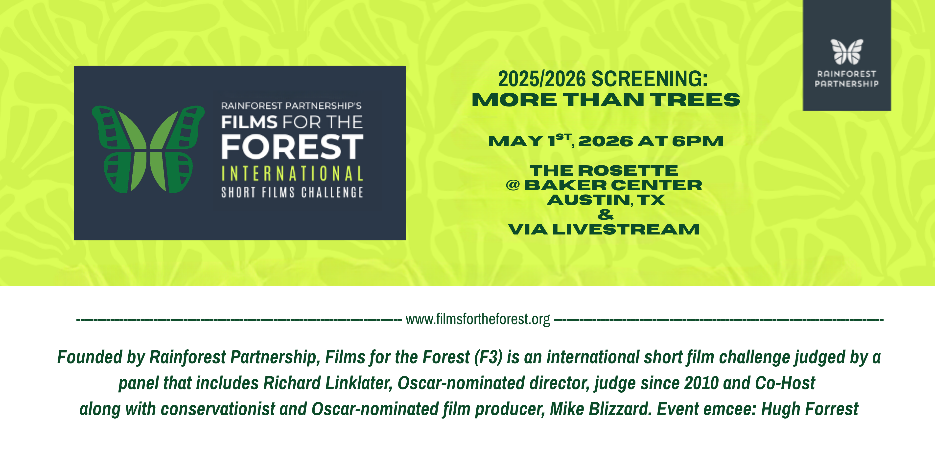 Launched by Rainforest Partnership in 2010, Films for the Forest invites filmmakers from around the world to share the voices and stories of forests worldwide, highlighting their rich biodiversity and local communities, their immense beauty and importance to the entire planet, the threats they face, and the opportunities for renewal.